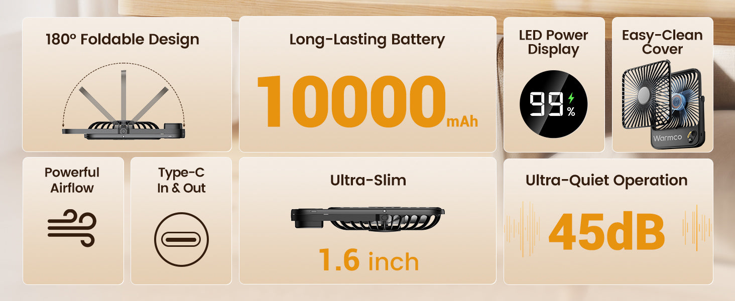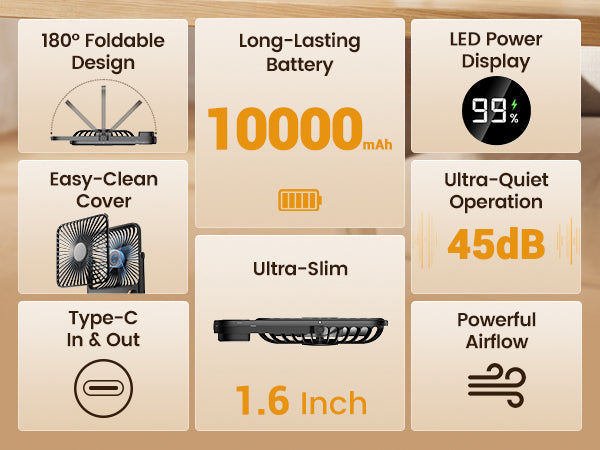 Powered by a massive 10000 mAh battery, enjoy uninterrupted cooling for 15-48 hours on a single charge. Perfect for full workdays or extended outdoor activities, this fan keeps you comfortable without frequent recharging interruptions.
