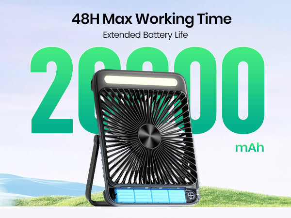 Equipped with a high-capacity 20,000mAh battery, stay cool all day with up to 15-48 hours of continuous operation on a single full charge. The 4 speed settings and 5-blade design provide powerful yet whisper-quiet cooling.